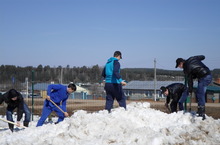 Сегодня провели субботник. Младшеклассники убрали мусор, старшеклассники разгребали снег.