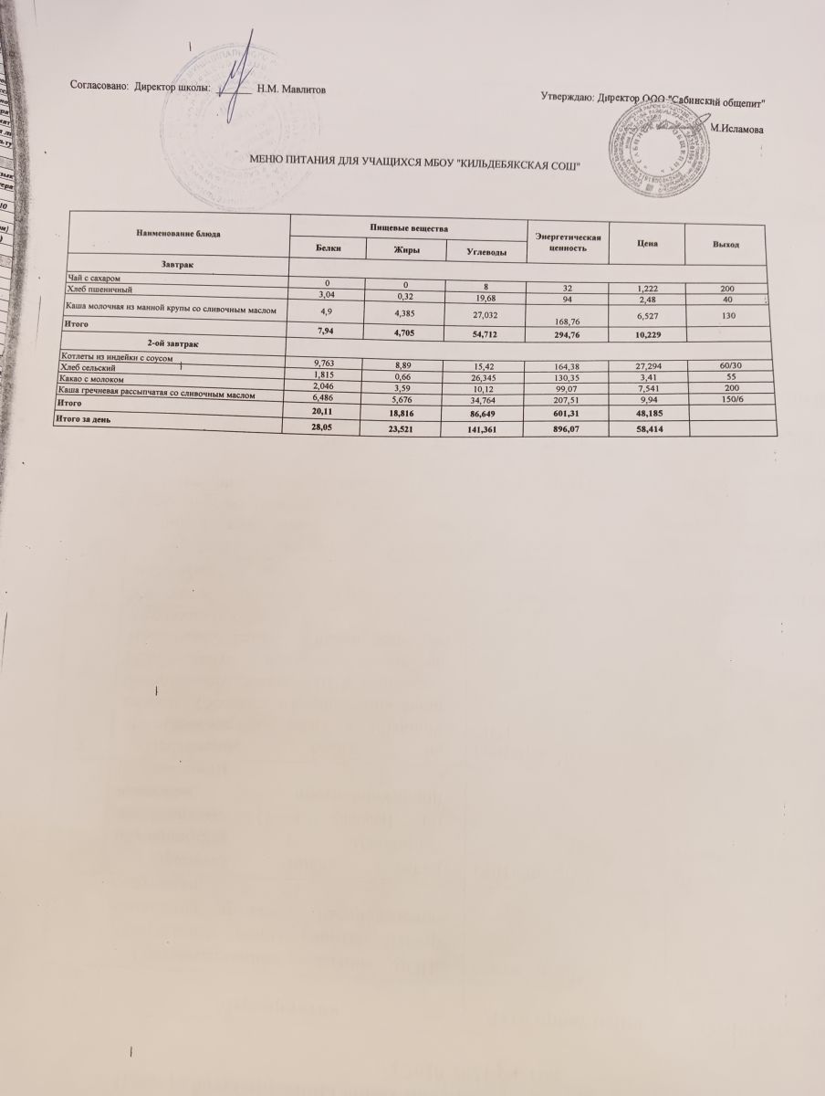 Примерное двухнедельное меню МБОУ "Кильдебякская СОШ" на 1-е полугодие 2025-2026 учебного года