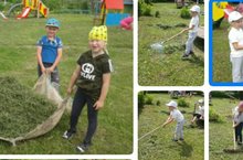 Менә көтеп алган җәйнең матур көннәре берәм-берәм үтеп баралар. Без балалар белән һәр көнне нинди дә булса бер тема буенча шөгыльләнергә тырышабыз. Саф һавада булганда да күптөрле күзәтүләр, уеннар белән беррәттән нинди дә булса файдалы эшәр башкарырга да өлгерәбез. Бүген без үзебез уйный торган урыннан Әхмәт абыйга печән җыярга булыштык. Күмәк эшләү күңелле дә файдалы да булды.