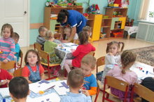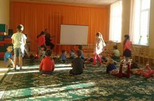 Занятия по музыкальному воспитанию в старшей и подготовительной группе проходят очень интересно. Дети активно и с большим удовольствием участвуют в музыкальных играх, организованных музыкальным руководителем Гиниятовым Р. А. В занятии дети поют под гитару и баян.