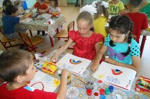 Сегодня рисовали радугу.Дети узнали о радуге, как атмосферном явлении. Что ее можно наблюдать в теплое время года, когда идет мелкий дождь и в то же время сквозь тучи на облака светит солнце. Солнечные лучи проходят сквозь дождевые капельки и образуют радугу.Выучив наизусть фразу "Каждый Охотник Желает Знать Где Сидит Фазан", закрепили цвета радуги. Смешивая разные цвета краски, научились получать новые цвета и т.д.