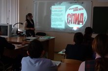 В рамках проведения Всероссийской акции СТОП ВИЧ/СПИД с целью информированности обучающихся о ВИЧ учитель биологии Ахмадеева Г.В. провела час общения с 9 классом на тему "Красная ленточка"