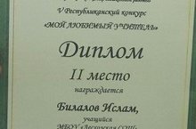 В октябре месяце прошел V Республиканский конкурс "Мой любимый учитель". В этом конкурсе участвовали многие наши учащиеся со своими рисунками и стихотворениями. Билалов Ислам, ученик 3 класса, стал победителем и был награжден дипломом за II место. Поздравляем Ислама и его руководителя. Желаем им дальнейших творческих успехов!