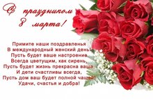 Поздравлем с чудесным праздником, с праздником женской красоты и очарования, с праздником весеннего вдохновения и светлой радости. В день 8 марта от всей души желаем постоянного ощущения счастья, ежедневного веселья души, волшебных чувств любви и нежности, прекрасного настроения и непобедимого интереса ко всему новому в жизни.
