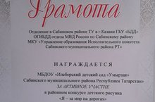 Район күләмендә үткәрелгән "Я- за мир на дорогах" конкурсында актив катнашкан өчен, бакчабыз ГРАМОТА белән бүләкләнде. Конкурста катнашкан һәр гаиләгә рәхмәтебезне белдерәбез.