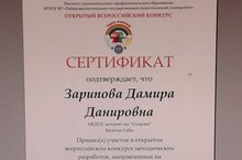 Шушы көннәрдә тәрбияче Дамира Данировна Яр Чаллы шәһәрендә, ботенроссия күләмендә оештырылган "Радуга открытий" шөгыль эшләнмәләре кокурсында катнашып, сертификатка ия булды. Котлыйбыз һәм алга таба да уңышлар телибез!