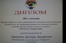 2013 нче елның декабреннән, 2014 нче елның 20 нче гыйнварына кадәр , Яр Чаллы шәһәрендә үткәрелгән “Радуга открытий” бөтенроссия конкурсында , безнең тәрбиячеләр дә җиңү яулады! Конкурс табигатьне саклау, экология темасын яктыртуны максат итеп куйган иде. “Сулыкларны өйрәнү, чистарту һәм саклау” темасына тәрбияче Дамира Данир кызы Зарипова әзерләгән методик эшләнмә сертификатка һәм 3нче дәрәҗәдәге дипломга лаек булды. Тәрбияче Алинә Илдус кызы Нургалиева җитәкчелегендә 6 яшьлек Закарова Нәфисәнең конфет кәгазьләре ярдәмендә ясалган чәчәкләр презентациясе сертификатка ия булды. Тәрбиячесе һәм балалар бакчасы мөдире оештыру комитетының РӘХМӘТ ХАТЫ белән бүләкләнделәр.