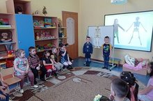 Воспитатель (физическая культура) провела беседу с детьми старшей группы на темы "Внешнее строение человека" и "Внутреннее строение тела человека". На занятие пригласили медицинскую сестру детского сада. Лилия Рашитовна рассказала, как работает организм человека, познакомила с органами дыхания, слуха, зрения и осязания. Детям было очень интересно, увлекательно, они узнали много нового про свое тело.