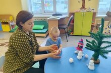 К детям в группу пришел из леса снеговик и принес с собой ёлочку. Вместе с ним спели песенку, потрогали настоящий снежок и налепили много снеговиков.