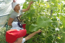 Дети средней группы вместе с воспитателем Зульфией Мислахутдиновной собирают урожай огурчиков.