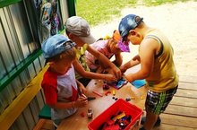 Ребята старшей группы любят собирать конструктор даже на улице. Хорошо, что последние дни лета еще такие хорошие и теплые.