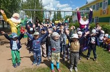 В программе: веселые танцы ясельной и 1 младшей групп "Малыши-карандаши", зажигательный танец мальчиков старших групп "Вперед четыре шага", озорной танец девочек старших групп "Зверобика", эстафеты "Гусеница", "Прокати мяч вокруг кеглей", игра на внимание "Что летит", шоу мыльных пузырей, рисунки мелом на асфальте.