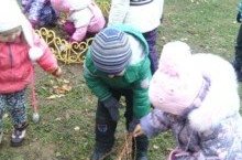 Воспитанники средней группы заняты сбором листьев и веток на участке.