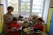 Первые участники выставки "Осенняя фантазия" показывают свои работы. Ильназ со своими родителями смастерил самолет из кабачка и моркови, сладкого ежика из груши и винограда. Ильвина с мамой сделали картину из листьев и сухих цветов. Наиля наполнила корзину осенними ягодами. Никита с мамой смастерили озеро с лягушками. Всем понравился паук со своим гнёздышком, которую принесла Зайнаб. Остальные ребята то же заинтересовались и обещали активно поучаствовать. Выставка продолжается.