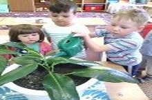 Воспитанники средней группы ухаживают за комнатными растениями.