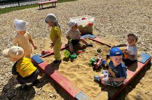 Дети группы раннего возраста с удовольствием проводят время в песочнице. Вместе с воспитателем строят разные замки, лепят куличики. Знакомятся с разными тактильными ощущениями, развивают мелкую моторику.