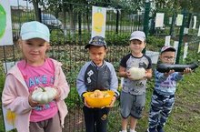 Ребята вместе с воспитателями ухаживают за растениями в огороде: поливают, пропалывают, рыхлят. И огород их порадовал урожаем кабачков патиссон и репы.