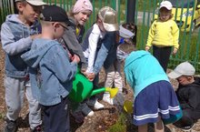 Весной, взрослые и дети нашего детского сада , на каждой игровой площадке, посадили сосенки. Ребята подготовительной группы, ухаживают за маленькими саженцами: рыхлят почву и поливают водой. А сосенки им благодарны, и радуют своей зеленой хвоей.