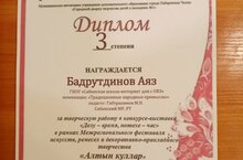Аубакирова Нурлана Фаридовна, под руководством педагога дополнительного образования Аубакирова Ф.М., заняла первое место IV Районном фестиваль - конкурсе детского и юношеского творчества, посвященный году семьи «ТАЛАНТЛЫ БАЛАЧАК»...