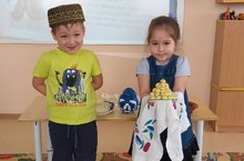 2 нче кечкенәләр төркеме балалары әбиләренең элек нинди матур кименәр кигәннәрен, аларның бизәнү әйберләрен өйрәнделәр.