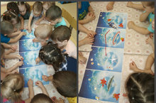 Вот такая коллективная работа получилась ко "Дню космонавтики" у первой младшей группы.