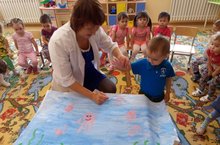 Рисование с помощью ладошек - одно из самых любимых занятий малышей. Оно дарит радость творчества, увлекает и удивляет. В рисовании ладошками есть что-то интригующее, загадочное, манящее. Все получившиеся фигурки из ладошек получаются не только яркими, но и очень личными, так как ладошка принадлежит лично ребёнку и никому другому. Дети первой младшей группы нарисовали осьминога с техникой печатания ладошкой. Научились опускать в гуашь ладошку и делать отпечатки. Дети остались довольными.
