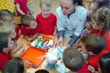 Сегодня во вторую младшую группу пришел доктор Айболит. А пришел он потому, что получил сообщение, что в нашем детском саду кто-то заболел. А заболел у нас котенок, он даже отказался от еды и игр с детьми. Доктор Айболит достал из своего чемодана градусник и измерил температуру котенку. Оказалось что у нашего котенка высокая температура и красное горлышко. Доктор Айболит дал лекарство котенку и ему сразу стало легче. Также Доктор спросил детей о том, кто их лечит когда у детей болит горло или животики. Все дети ответили что мама.