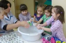 Уртанчылар төркемендә балалар белән курчакларның киемнәрен юдык.