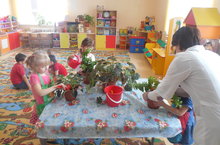 В нашем детском саду в каждой группе размещен уголок природы. Минимальный состав уголка природы в группе включает комнатные растения, подобранные в соответствии с возрастом детей. Воспитатель старших групп Низамиева Ф.С ознакомляет детей с разнообразием комнатных растений, учит устанавливать взаимосвязь между состоянием растения и условиями окружающей среды. Педагог объясняет, что такое правильная и дозированная поливка, почему одинаково опасен недолив и перелив растения (в первом случае растение начинает засыхать, терять жизнестойкость, во втором-заболевают и загнивают корни).В процессе работы с комнатными растениями закрепляют знания детей о строении растений, особенностях их роста, ухода за ними.