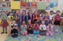 Балаларны татар халкының милли киеме, фольклоры, көнкүреше белән таныштыру максатыннан бүген уртанчылар төркемендә бердәм эшчәнлек милли киемнәргә багышланды. Балалар янына кунакка милли киемнәрдән татар егете һәм кызы килде, ләкин аларның читекләре юк иде. Балалар белән бергәләп тәрбияче Ахметшина А.Г. кунакларга матур читекләр ясап, бизәп бирделәр. Иҗади эштән соң алар бергәләшеп милли уеныбыз "Яулык салышны" уйнадылар, татар "Әпипә" җырына күңел ачтылар.
