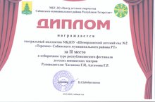 Поздравляем детский театральный коллектив МБДОУ «Шеморданский детский сад №2 «Теремок» Сабинского муниципального района РТ» занявшая 2 место в отборочном туре республиканского фестиваля детских юношеских театров. Руководители Хасанова Г.И., Адгамова Г.Р. Желаем дальнейших творческих успехов.