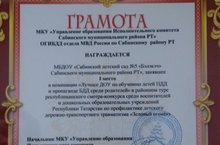 В районном туре республиканского смотра – конкурса среди воспитателей и дошкольных образовательных учреждений Республики Татарстан по профилактике детского дорожно – транспортного травматизма «Зеленый огонек» наш детский сад был признан лучшим и занял 1 место в номинации «Лучшее ДОУ по обучению детей ПДД и пропаганде БДД среди родителей». Коллектив был награжден грамотой и ценным подарком. Желаем воспитателям дальнейшей плодотворной работы в области профилактики ДДТТ.