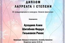 Подведены итоги 11 Международного дистанционного конкурса " Зимняя фантазия" г. Москва, в котором участвовали учащиеся музыкального отделения по классу баяна Сабинской ДШИ имени Хуснулы и Аллагияра Валиуллиных. ( Кл. преп.Фатыхова Р.Г.)