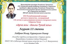 В марте в г.Арск в заочной форме прошел Республиканский конкурс детского творчества «Арча ягы - данлы Тукай ягы», посвященный 136 летию со дня рождения великого татарского поэта Габдуллы Тукая. Конкурс ежегодно проводится в целях духовного и нравственного воспитания молодого поколения, широкого приобщения к сокровищам татарской национальной и художественной культуры, сохранения лучших традиций, популяризации и дальнейшему развитию профессионального мастерства, самодеятельного народного искусства, выявлению, стимулированию и поддержки молодых дарований.