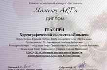 В Межрегиональном конкурсе " Момент Арт" (заочно) хореографический коллектив ДШИ "Яшьлек" рук.Мубаракзянова А.З. удостоился диплома ГРАН-ПРИ.