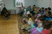 Корбан гаете уңаеннан бакчабызга Әминә абыстайны чакырдык. Ул балаларга вәгазь сөйләде, догалар укыды. Соңыннан балалар корбан итеннән пешкән аштан авыз иттеләр.