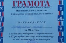 Поздравляем нашу сотрудницу Лутфуллину Н.А. с Грамотой Отдела по делам молодежи и спорту Исполнительного комитета Сабинского муниципального района РТ за III- место районного отборочного соревнования к IX -республиканскому темпо-турниру по шахматам. Желаем новых побед!