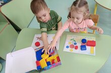 Воспитанники первой младшей группы №2 познакомились с логическими блоками Дьенеша. Дети нашли в группе интересную коробочку с фигурами. Рассмотрев фигуры, согласились поиграть в предложенные игры с геометрическими фигурами. Дети находили фигуры по цвету и форме, по размеру и составили картинки. Вот так увлекательно и занимательно прошло знакомство с блоками Дьенеша.