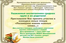В нашем детском саду объявлен конкурс юных чтецов "Посвящаем мамам нежные слова..." среди воспитанников средних групп. Для участия в конкурсе необходимо участникам выучить стихотворенье о маме. Конкурс состоится 7 марта 2024 года на базе нашего детского сада. Желаем всем успехов!!!