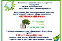 "ЭКОВЕСНА 2023" республика конкурсы кысаларында безнең балалар бакчасында "Кагаз бумы" экологик акциясе старт алды. Акциянең төп бурычы-тәрбияләнүчеләрнең игътибарын ресурсларны саклауга җәлеп итү, табигый ресурсларын куллануның исрафлылыгы турында уйланырга мәҗбүр итү, шулай ук калдыкларны икенчел эшкәртүне үстерүгә өлеш кертү. Һәр теләгән кеше урманнарны, экологияне һәм планетабызның табигый матурлыгын саклауның гомуми эшенә үзеннән өлеш кертә ала.