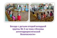 Воспитатель Хакимзянова Аниса Фаруковна провела беседу с детьми второй младшей группы № 2 на тему «Основы антитеррористической безопасности». Целью данной беседы являлось довести до сознания детей важность соблюдения правил антитеррористической безопасности, умения проявлять осторожность и осмотрительность во время прогулки. Довести до сознания детей, что нельзя быть одному без надежного взрослого. Воспитывать у детей ответственность за свою безопасность, объясняя, что соблюдение правил сохранит их жизнь и здоровье.