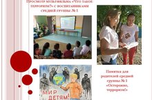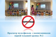 Воспитанники средней группы № 1 вместе с воспитателем научились противостоять опасности и защищать себя в экстремальной ситуации, у них сформировалось представление о мерах предосторожности и возможных последствиях их нарушения, о способах защиты от террористов. Был организован просмотр мультфильма «Что такое терроризм?».