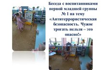 Воспитатель Хамзина Равиля Рашитовна провела беседу с воспитанниками первой младшей группы № 1 на тему «Антитеррористическая безопасность. Чужое трогать нельзя – это опасно!»