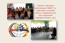 Сегодня заведующий Адгамова Гузель Рафисовна провела занятие- обучение по действиям в условиях угрозы совершения или при совершении террористического актас работниками МБДОУ , а также раздала памятки "Осторожно терроризм".