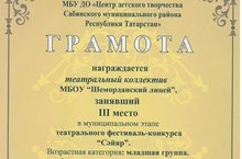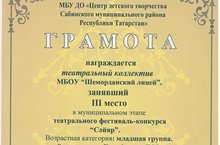 В МБУ ДО «Центр детского творчества Сабинского муниципального района Республики Татарстан» прошел муниципальный этап театрального фестиваля-конкурса «Сәйяр». По итогам конкурса театральный коллектив Шеморданского лицея занял 3 место и был награжден Грамотой.