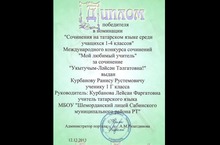 Декабрь аенда Республика күләмендә үткән «Укытучым Ләйсән Тәлгатовна» дип исемләнгән сочинение белән 1 Г сыйныфы укучысы Курбанов Рәнис ”Сочинения на татарском языке среди учащихся 1-4 классов” номинациясендә җиңүче булды. Рәнис диплом һәм истәлекле бүләкләр белән бүләкләнде.Укучыбызга укуында зур уңышлар, киләчәктә дә җиңүләргә ирешүен телибез.