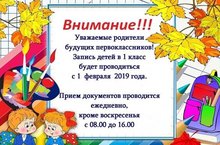 Уважаемые родители будущих первоклассников! Запись детей в 1 класс будет проводиться с 1 февраля 2019 года. Прием документов проводится ежедневно, кроме воскресенья с 8.00 до 16.00