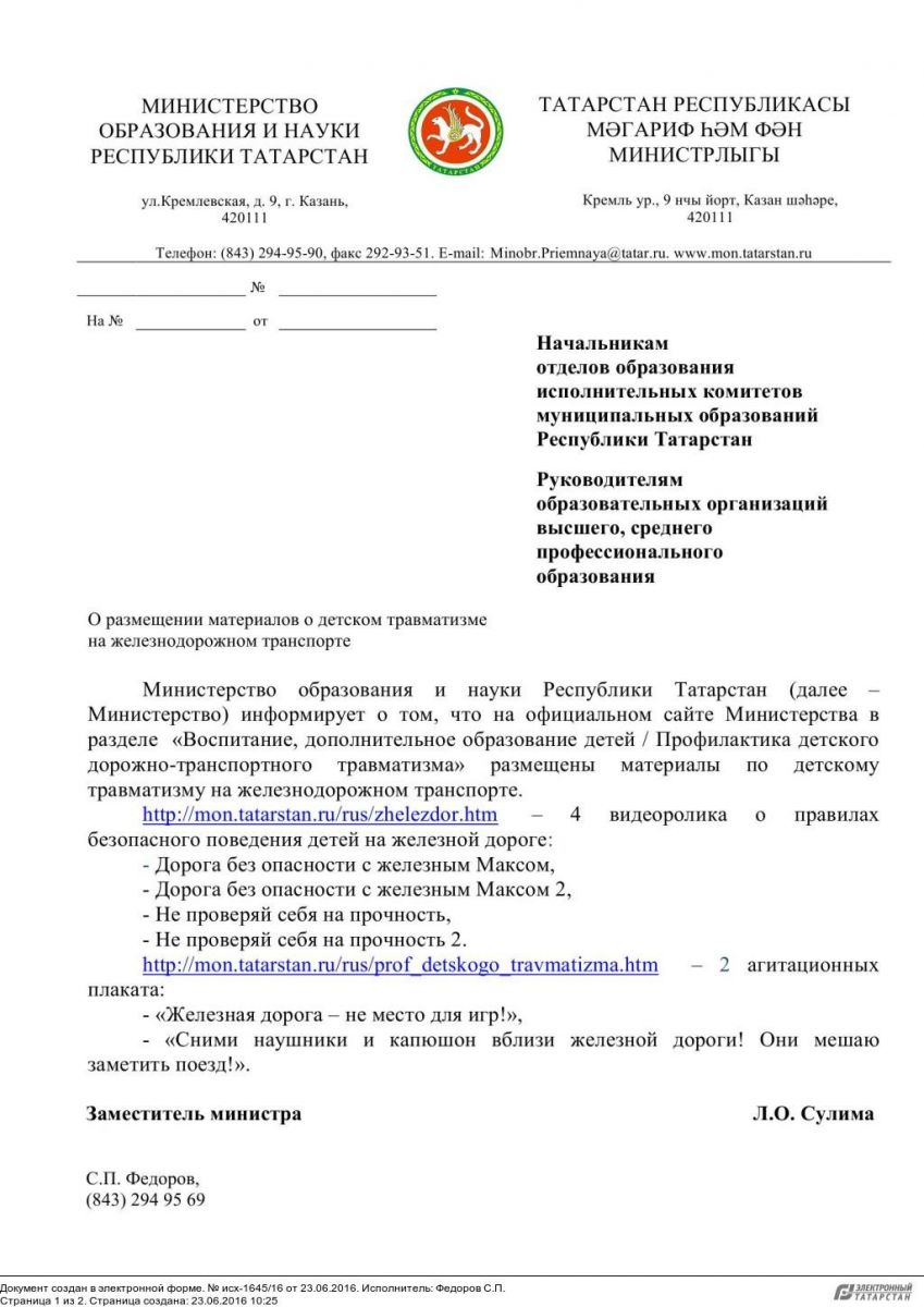 МОиН РТ "О размещении материалов о детском травматизме на железнодорожном транспорте"
