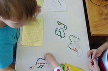 "Әбиемнең серле сандыгы". 25.02.2015 Бу атна эшчәнлегебезне балаларны татар халкының милли киемнәре һәм аларның бизәлеше белән таныштыруны дәвам итүгә багышладык. Бүген иҗади сәнгать-әвәләү шөгылендә традицион булмаган пластинография ысулы белән хатын -кызлар аяк киемен бизәдек.