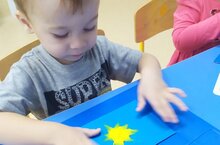 Буген без кечкенәләр белән сары төс белән таныштык. Пластилинны түгәрәкләп кояш ясадык.Нурларны бармаклар ярдәмендә сылап эшләдек.